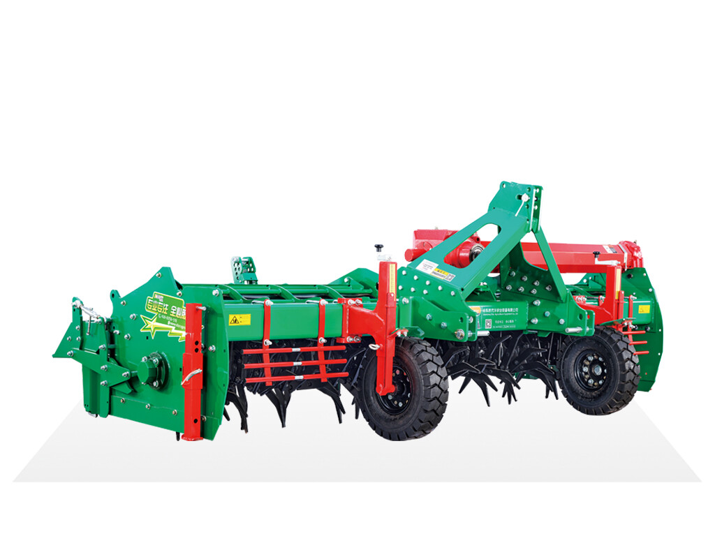 作业时,由拖拉机后悬挂装置与设备主机架相连,调整好限深轮深度;使用万向节传动轴将拖拉机后输出轴与变速箱相连接,经过传动机构将动力从拖拉机传到工作装置。